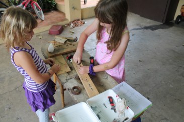 About every other Saturday, I back the car out of the garage to make space for my girls (just like every other room in our house) to play ‘construction’. We have buckets of wires, wood pieces, shells, rocks, even some recycled trash I have found on the beach, along with basic tools such as hammers, screwdrivers, and pliers. With a few benches set-up, my daughters work on constructing their designs, either from in-the-moment inspiration or from journals and notepads. They make shells factories, traps, machines or princess-power suits, usually with loud music and curious cats rounding out the scene.